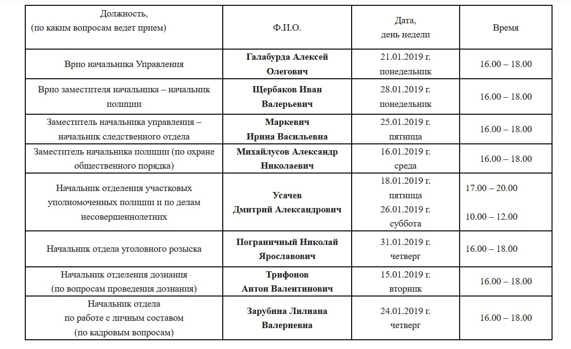 Прием граждан начальником полиции осуществляется по предварительной записи по телефону (36561) 78127 (в рабочие дни с 09:00 до 12:00 ч. и с 14:00 до 18:00 ч.). В дни приема граждан запись не ведется.
