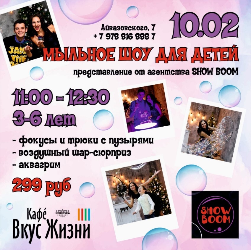 10.02: Впервые в кафе "Вкус Жизни"! Мыльное шоу от агентства по организации мероприятий SHOW BOOM! Авторское представление, завораживающие трюки с пузырями, светящиеся шары, фокусы, гигантский шар-сюрприз, аквагрим и многое другое! Подарите ребенку восторг и незабываемые эмоции!