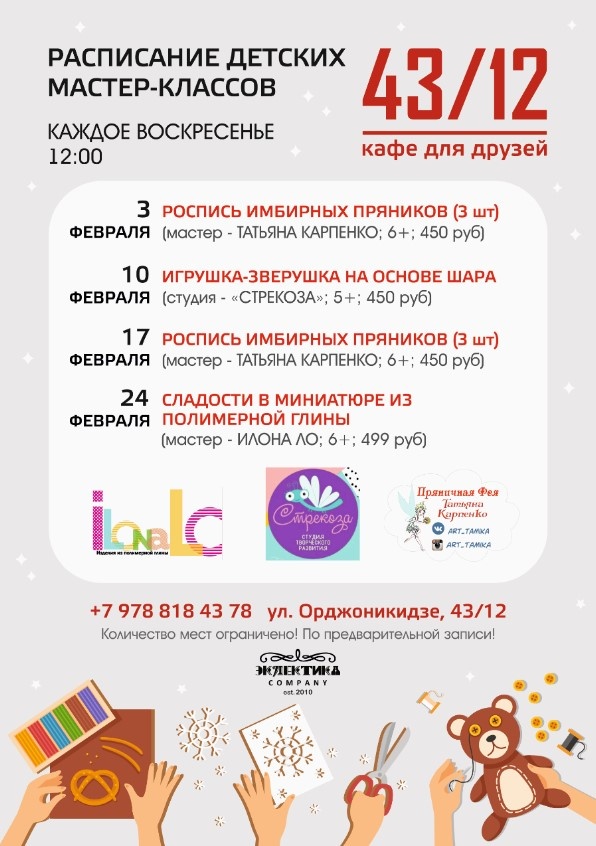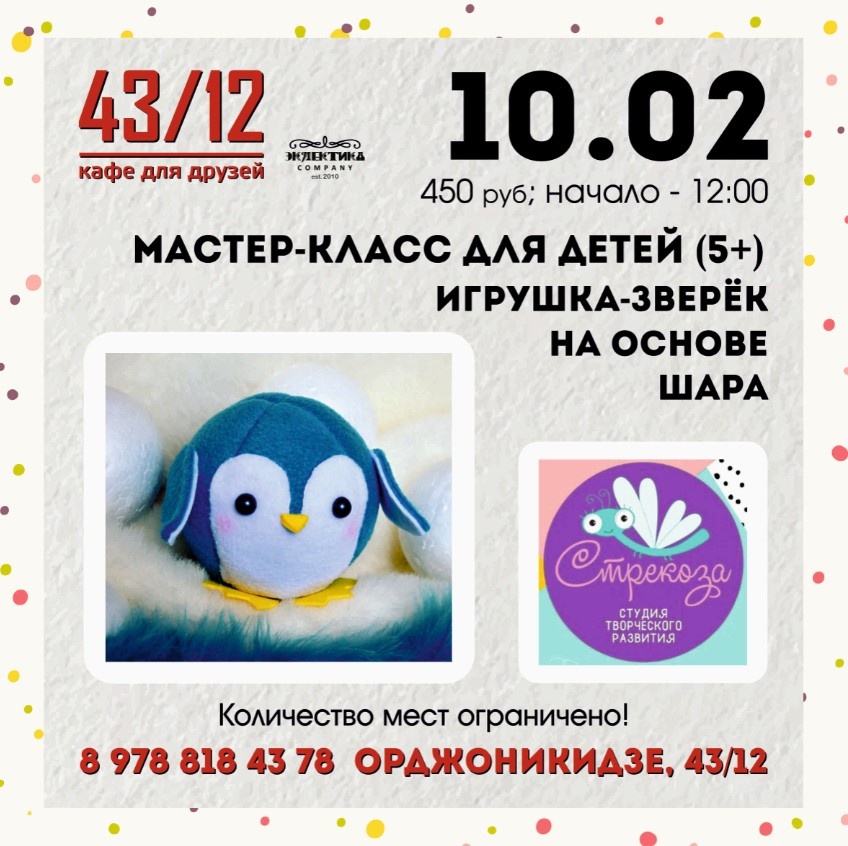 10-го февраля приглашаем ребят от 5-ти лет мастерить игрушку-зверька на основе шара. Мастер-класс от творческой студии "Стрекоза". Начало - 12:00. Стоимость участия - 450 руб. Количество мест ограничено! Записаться можно по телефону: +7 978 818 43 78.