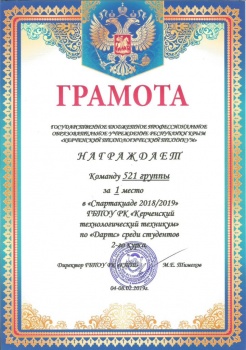 Первое место завоевал дружный коллектив группы № 521 (профессия - Сварщик ручной и частично механизированной сварки (наплавки). Классный руководитель - Аникина Т.В.) - 371 очко.