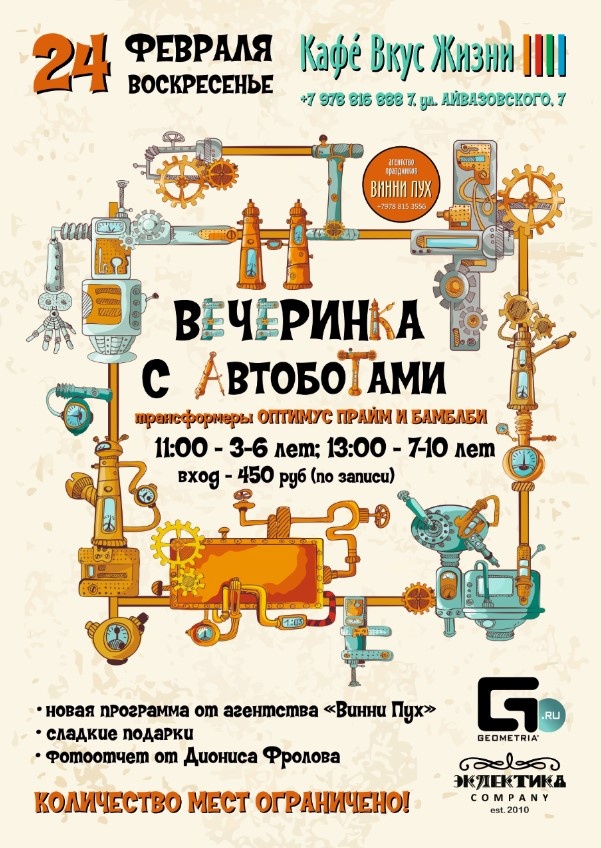 24-го февраля специально для наших юных гостей агентство праздников «Винни Пух» презентуют свою новинку! Развлекательная программа: "Вечеринка с автоботами - Оптимус Прайм и Бамблби". Трансформеры приглашают ребят весело и незабываемо провести время в духе супергероев!