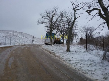 Как стало известно журналисту, в Керчь из Краснодарского края приехали туристы. Их небольшой автобус не смог проехать, так как дорогу перекрыл другой туристический автобус также из Краснодарского края. Что произошло - пока точно не известно, Предположительно, обочину занесло, и автобус пошел юзом за пределы дороги.