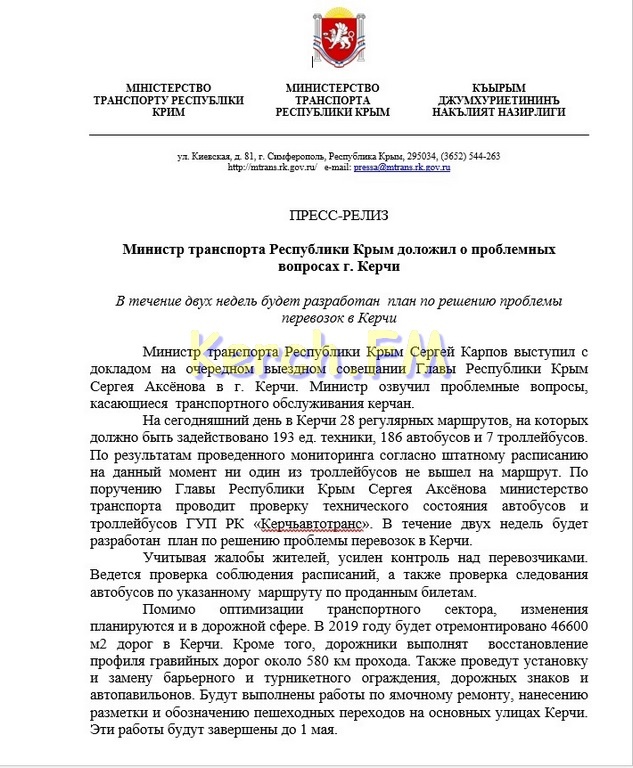 Также, Минтранс уверил, что дорожники выполнят  восстановление профиля гравийных дорог около 580 км прохода. Также проведут установку и замену барьерного и турникетного ограждения, дорожных знаков и автопавильонов. Будут выполнены работы по ямочному ремонту, нанесению разметки и обозначению пешеходных переходов на основных улицах Керчи. Эти работы будут завершены до 1 мая.