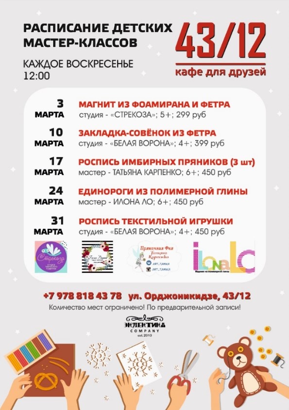 Полное расписание творческих занятий для детей в марте (открыта запись на все мастер-классы):