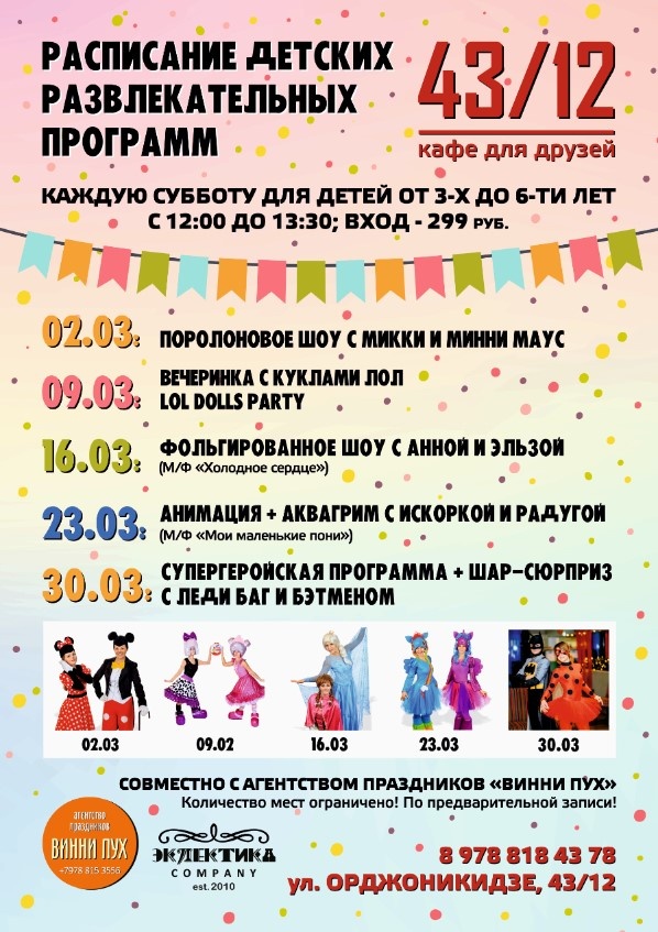 Возрастная категория от 3-х до 6-ти лет. Время проведения - с 12:00 до 13:30. Единая цена билета в марте - 299 руб. Количество мест ограничено (по предварительной записи +7 978 818 43 78). Оплатить билет можно только в кафе (ул. Орджоникидзе, 43/12). Открыта запись на все программы.