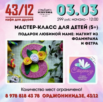 Прекрасный подарок любимой маме к 8-му марта! В это воскресенье, 03.03, с мастером от творческой студии "СТРЕКОЗА" делаем нежный магнитик из фоамирана и фетра.