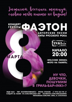 08 марта, Гриль-бар «INKI», начало в 20:00.