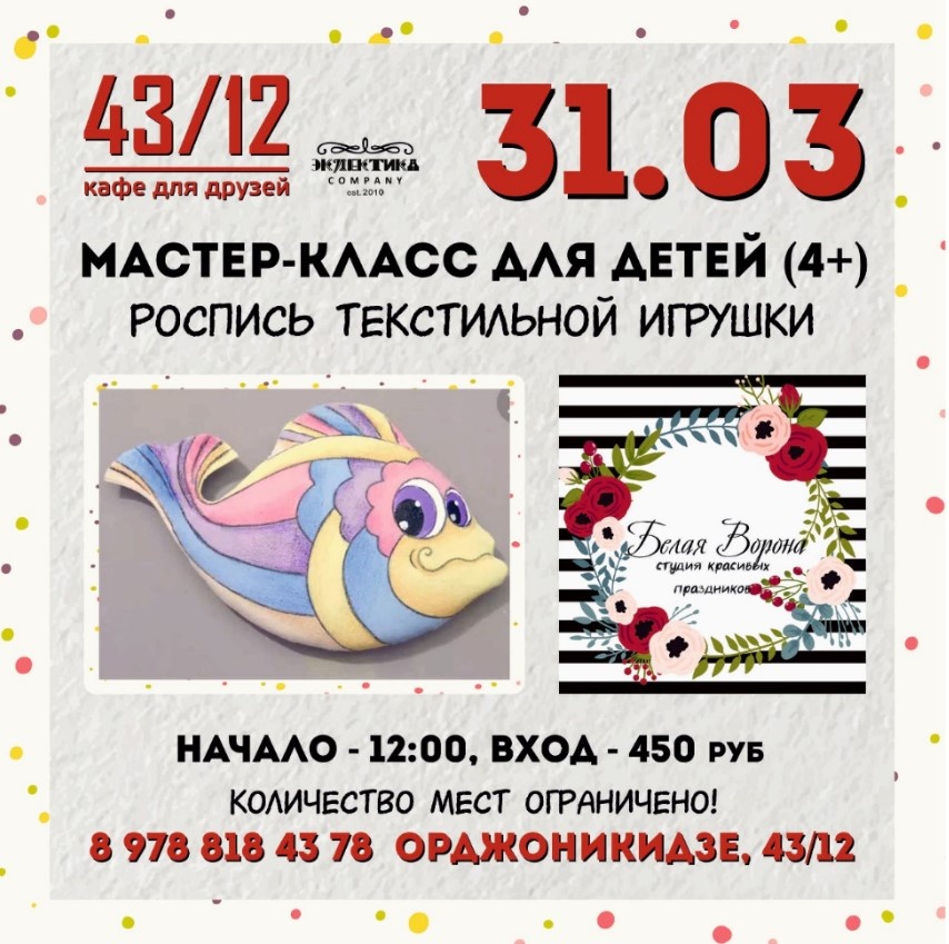 Для участников подготовлено невероятно интересное занятие! 31-го марта будем вместе расписывать текстильные игрушки! Ваши детки пробовали себя в таком направлении handmade? Не пропустите занимательное развлечение!