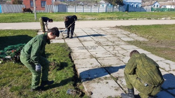 В этот раз обе команды ВПК "Эльтиген"и "18+" работали одновременно, так как объект был достаточно масштабный. Как и прежде архитектурные элементы очищены от растительности и грязи, где необходимо побелены. Обкопаны деревья, спилены сухие ветки. Были очищены от земли и растительности тротуарные дорожки ведущие к памятнику. Растительный и бытовой мусор в объеме одного кубометра в мешках отнесли сразу на контейнерную площадку.