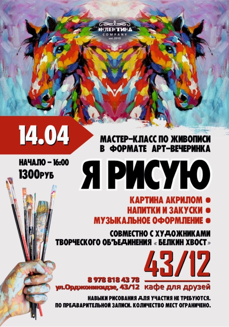 Процесс рисования - настоящая эмоциональная терапия. Один из верных способов отвлечься от будничных забот - расположиться за мольбертом. 14-го апреля кафе 43/12 приглашает абсолютно всех желающих погрузиться в мир живописи и воображения.