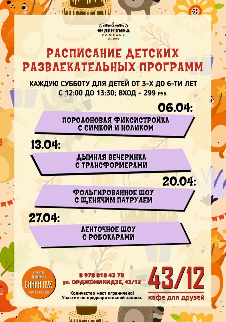 20-го апреля (суббота) кафе 43/12 приглашает ребят на зрелищное фольгированное шоу от агентства праздников "Винни Пух" с героями м/ф "Щенячий патруль". Море фольги - океан эмоций! Игры, конкурсы, танцы, аквагрим! Сценарий программы будет интересен и мальчикам, и девочкам. Поспешите с записью, количество мест ограничено.