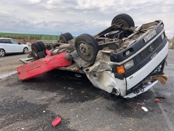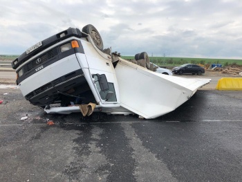 По неизвестной причине произошло столкновение грузовика и автомобиля «Lexus», от удара грузовой автомобиль опрокинулся и получил серьезные повреждения. Данных о пострадавших нет.