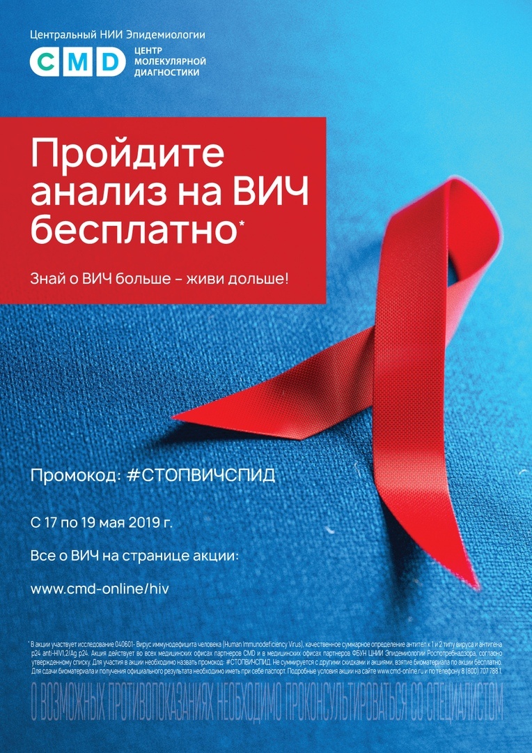 C 17 по 19 мая с 7-11.00 приходите в лабораторию CMD, воспользуйтесь промокодом #СТОПВИЧСПИД и узнайте свой ВИЧ-статус.