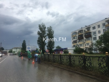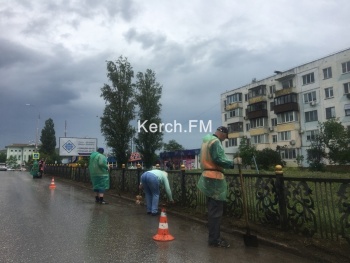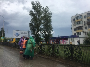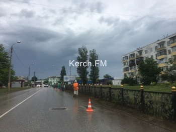 В Керчи убирали дорогу под дождем