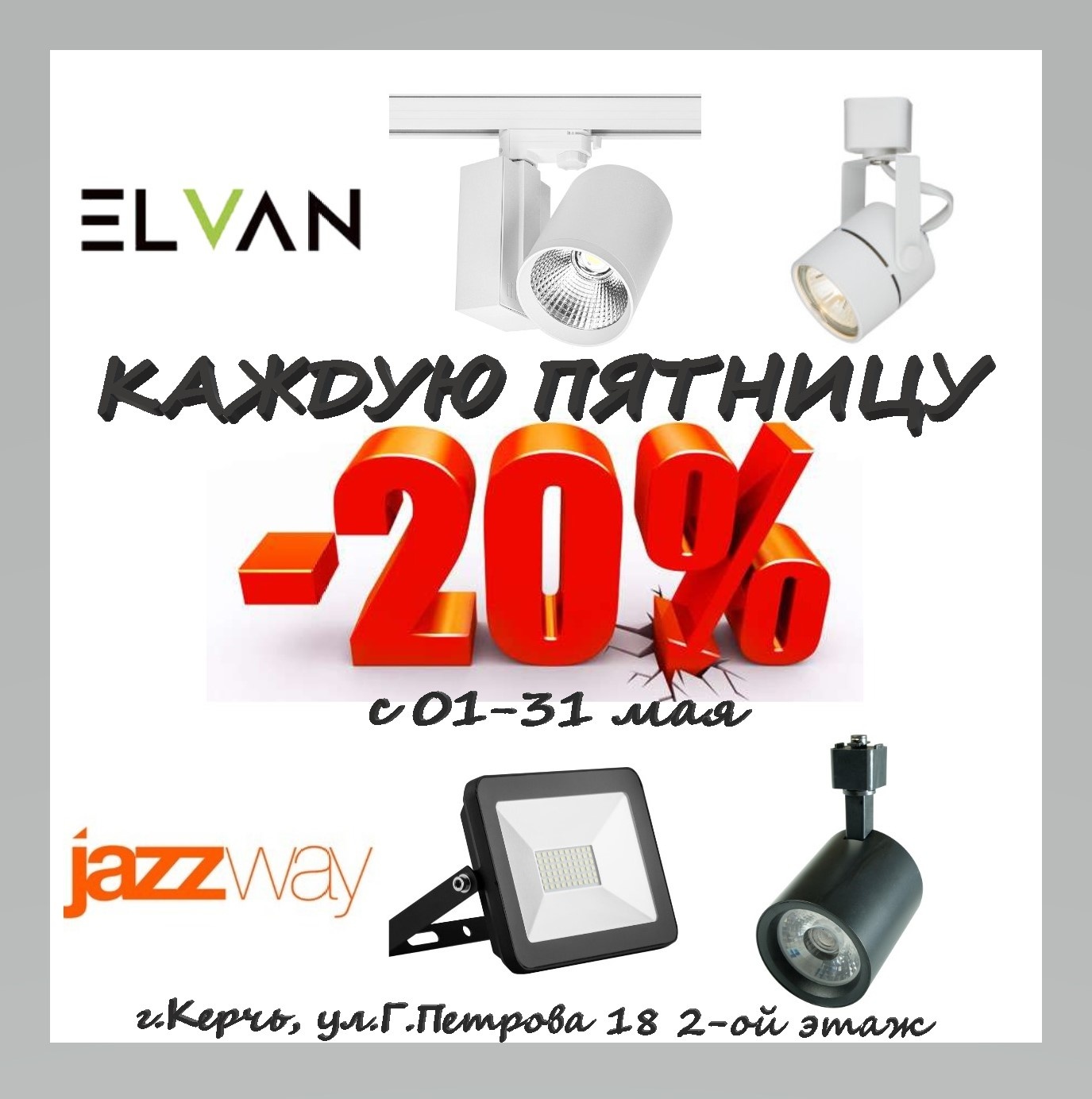 Только в мае!!! Акция на всю продукцию светодиодных трековых светильников, прожекторов (Jazzwey, Elvan), а также на все бра. Ждём!!!