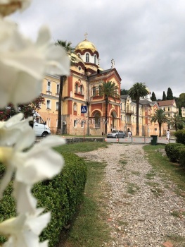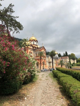 Отправились гулять по Новому Афону. Первое, что посетили - Ново-Афонский монастырь. Вход свободный, если ты одет неподобающе - открыты плечи и колени, нет головного убора у женщин, можно воспользоваться фартуками и платками, которые бесплатно лежат при входе. Сам монастырь внутри очень красивый. На стенах, в местах, где облупилась краска, надписи, вроде «Вася Москва» и «Здесь был Саша». Эти надписи появились, когда монастырь закрывали и он долгое время использовался под склады, говорят здесь были даже дискотеки.