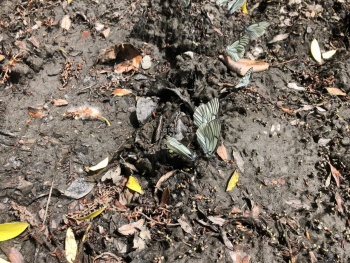 Поехали чуть дальше к даче Сталина. Здесь есть место для кемпинга. Заехать к озеру - платно, оставить машину на обочине - бесплатно. Пошли пешком. Там люди даже купаются (хотя здесь запрещено) и загорают. Сюда впадают горные реки, вода мутная и холодная. На земле сидит много бабочек. Отправились дальше.