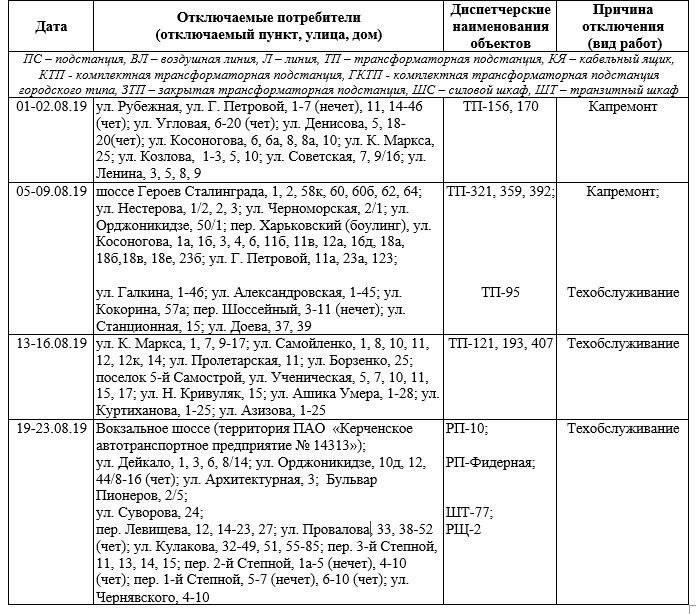 ГУП РК «Крымэнерго» сообщает о том, что в связи с плановым ремонтом электрооборудования в июле в период с 8 до 17 часов будут происходить отключения линий электропередачи согласно нижеприведенному графику, - передаёт Керчь.ФМ