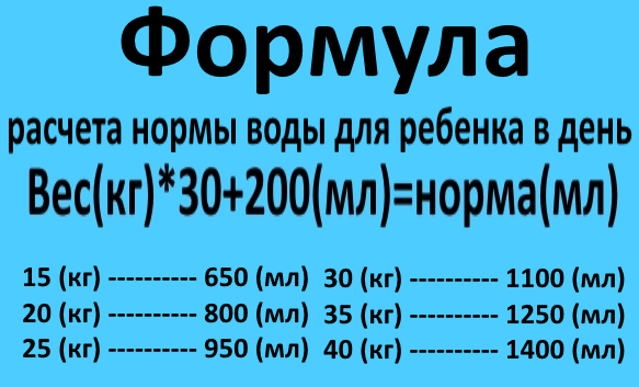 Здоровье ребенка - одна из главных забот родителей. Все знают, что вода играет ключевую роль в формировании детского организма и укреплении иммунитета. Так, тело ребенка на 80% состоит из воды, а взрослого человека - на 60%. Вода легко усваивается организмом и оказывает сильное влияние на все протекающие в нем процессы. Ее нехватка приводит к ухудшению самочувствия, снижению иммунитета и даже увеличению веса. Для удобства была разработана формула расчета нормы воды для ребенка в день, в принципе она применима и для взрослых.