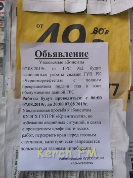 Завтра, 7 августа, на ГРС № 2 будут выполняться работы силами ГУП РК «Черноморнефтегаз» с полным прекращением подачи газа в зоне обслуживания данной ГРС. Об этом сообщает пресс-служба «Крымгазсети», - передает Керчь.ФМ,