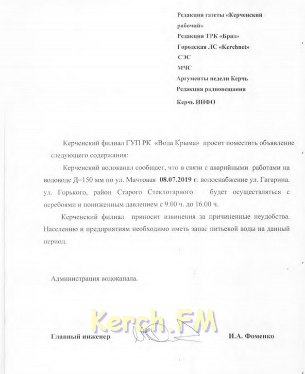 В Керчи в районе Горького, Старого Стеклотарного, Гагарина сегодня будут перебои с водой. Об этом сообщает пресс-служба водоканала, - передает Керчь.ФМ.