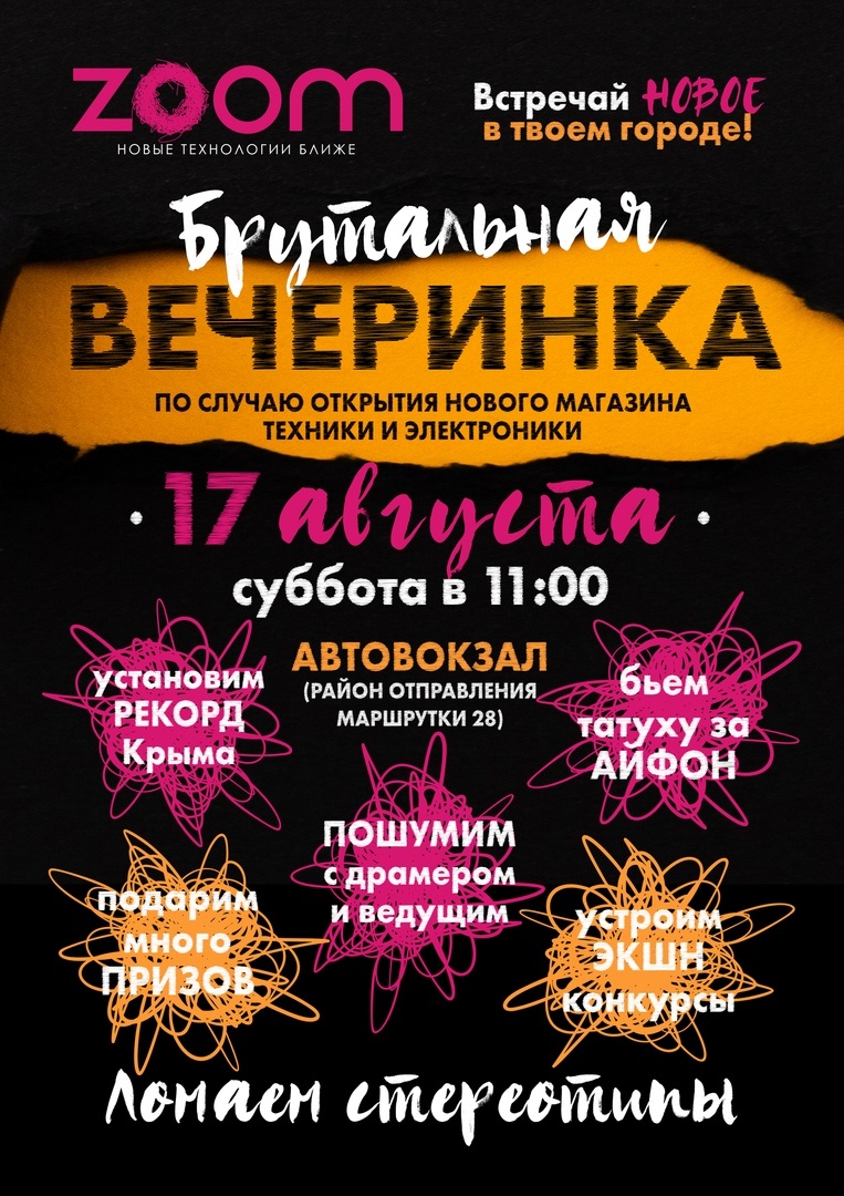 Брутальная вечеринка по случаю ОТКРЫТИЯ нового магазина техники и электроники.
