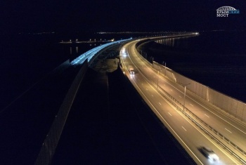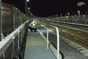 На Крымском мосту протестировали систему освещения железной дороги. На километровом пилотном участке, ближе к таманскому берегу, на три часа включили почти 150 светильников. Они расположены на стойках с шагом от 13 до 16 м. Степень освещенности путей в темное время суток проверили на соответствие проектным расчетам.