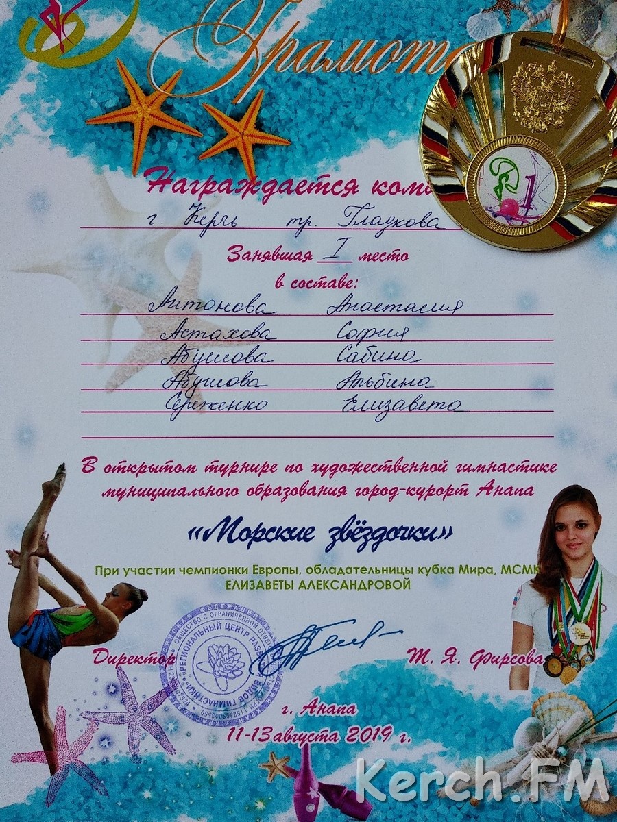 В Региональном Центре развития видов гимнастики город Анапа 11 августа, состоялся открытый турнир по художественной гимнастике "Морские звёздочки" при участии чемпионки Европы, обладательницы кубка Мира Мастера Спорта Международного Класса, Елизаветы Александровой. Об этом сообщил редакции Керчь.ФМ тренер керченских спортсменок.