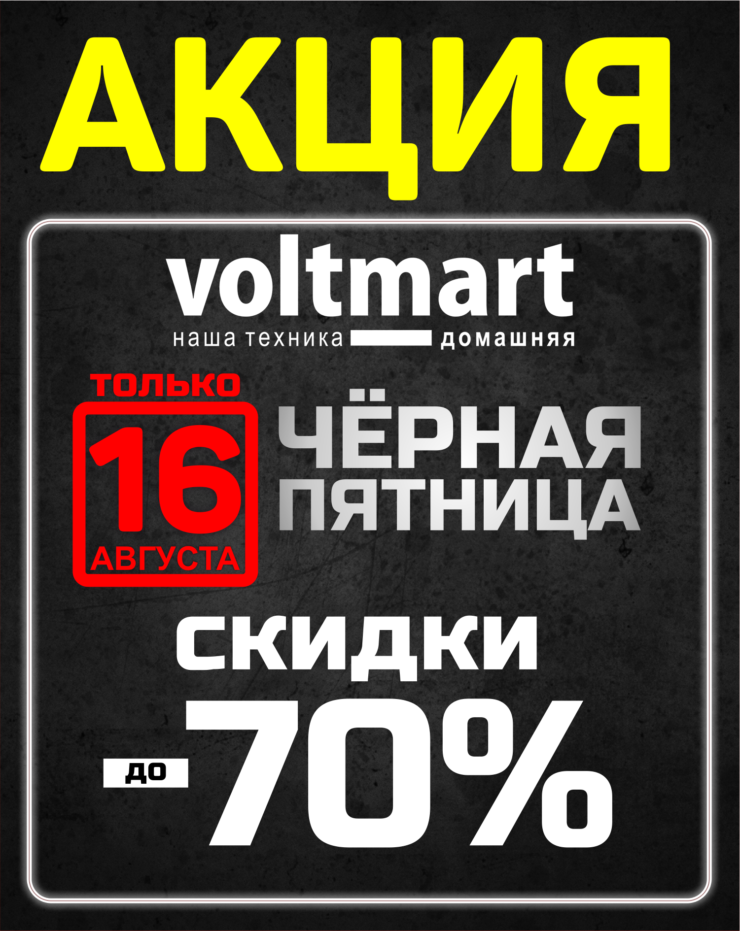 1.ОРГАНИЗАТОР АКЦИИ ООО "ВОЛЬТ МАРТ КРЫМ" 295000, РЕСПУБЛИКА КРЫМ, Г. СИМФЕРОПОЛЬ, УЛ. МОЛОДЕЖНАЯ, ДОМ 102, ОГРН 1149102000816 ИНН 9102000969 КПП 91020100. СРОКИ ПРОВЕДЕНИЯ АКЦИИ 16.08.2019 Г. 2. ПОД АКЦИЕЙ «Черная Пятница» СЛЕДУЕТ ПОНИМАТЬ стимулирующее мероприятие со специальными ценами, в период действия акции. *скидки от 5% до 70%. С ИНФОРМАЦИЕЙ ОБ ОРГАНИЗАТОРЕ АКЦИИ, О ПРАВИЛАХ ЕЁ ПРОВЕДЕНИЯ, КОЛИЧЕСТВЕ ПРИЗОВ ИЛИ ВЫИГРЫШЕЙ ПО РЕЗУЛЬТАТАМ АКЦИИ, СРОКАХ, МЕСТЕ И ПОРЯДКЕ ИХ ПОЛУЧЕНИЯ МОЖНО ОЗНАКОМИТЬСЯ ПО ТЕЛ.8 800 55 55 130 ИЛИ НА САЙТЕ VOLTMART.SU. НЕ ЯВЛЯЕТСЯ ПУБЛИЧНОЙ ОФЕРТОЙ. КОЛИЧЕСТВО ТОВАРА ОГРАНИЧЕНО.ВОЛЬТМАРТ. по адресу: г.Керчь, ул. Сенная площадь, 1 (центральный рынок).