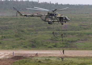 Высадку десанта прикрывал боевой вертолет Ми-28Н «Ночной охотник». Вертолет, с которого осуществлялась высадка десанта - Ми-8АМТШ - является многоцелевым вертолетом, снаряженным управляемым вооружением, новой авионикой и усиленной бронезащитой.