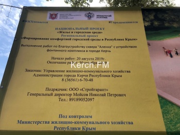 Около входа в сквер установили проект выполнения работ по благоустройству сквера «Аленка» с устройством фонтанного комплекса, согласно которому работы должны завершить 30 октября 2019 года.