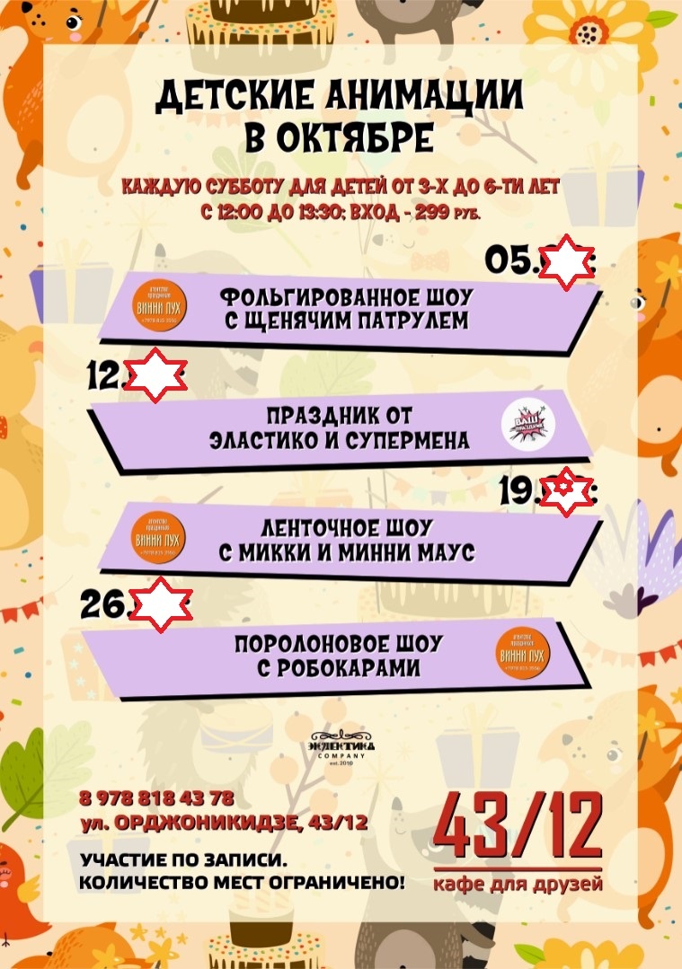 По субботам детские анимации для детей от 3-х до 6-ти лет.