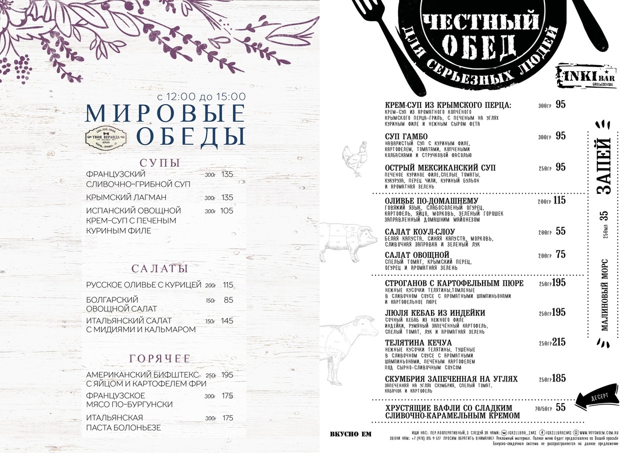 2. Прекрасное меню честных обедов Гриль-бар "INKI" и мировых обедов на "Твоей Веранде"