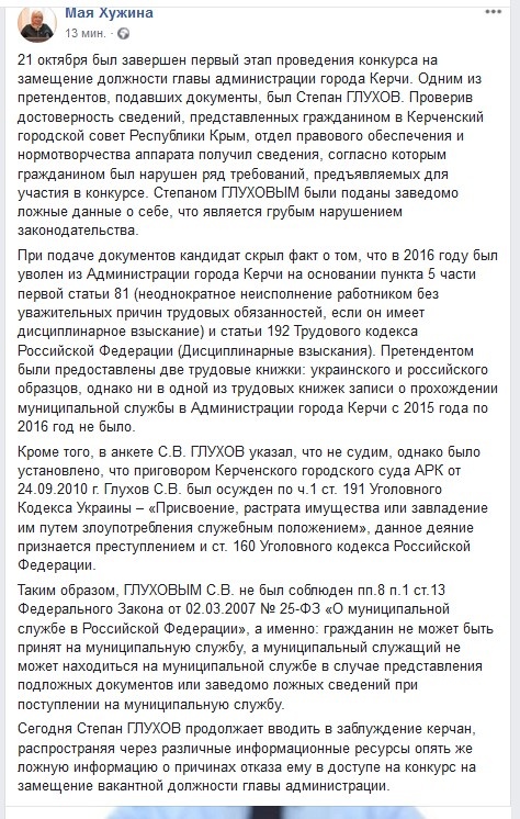 «21 октября был завершен первый этап проведения конкурса на замещение должности главы администрации города Керчи. Одним из претендентов, подавших документы, был Степан ГЛУХОВ. Проверив достоверность сведений, представленных гражданином в Керченский городской совет Республики Крым, отдел правового обеспечения и нормотворчества аппарата получил сведения, согласно которым гражданином был нарушен ряд требований, предъявляемых для участия в конкурсе. Степаном ГЛУХОВЫМ были поданы заведомо ложные данные о себе, что является грубым нарушением законодательства.