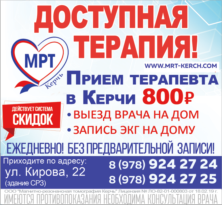 В многопрофильном медицинском центре «МРТ Керчь» ежедневно принимает врач-терапевт с большим опытом работы. Стоимость приема врача 800 р. Если у вас есть жалобы на плохое самочувствие — обращайтесь к нам! Предварительно позвоните и приходите на осмотр к врачу в удобное для Вас время.