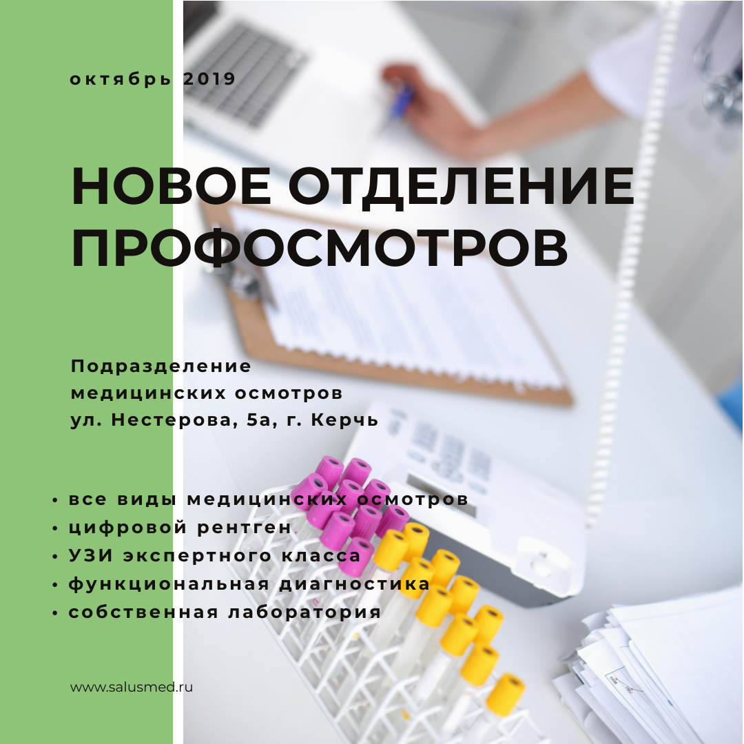 В медицинском центре «Салюс» открылось новое отделение профосмотров по адресу г. Керчь, ул. Нестерова 5а, где можно будет пройти медосмотр по любому из нужных вам направлений.