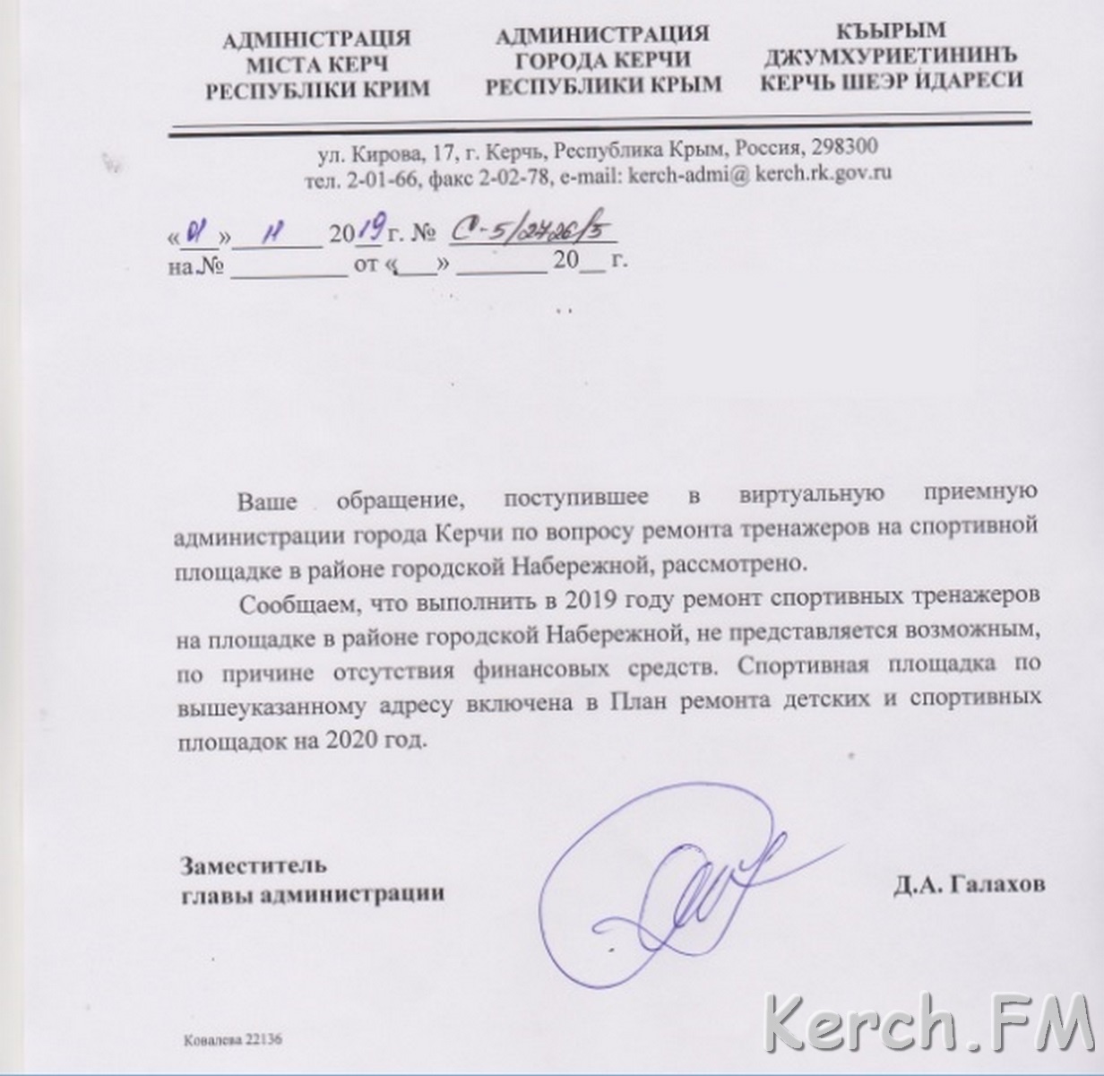 Для того, чтобы отремонтировать тренажёры на Набережной нужно совсем мало. Керчанин написал в виртуальную приемную главы администрации просьбу отремонтировать три тренажера, но ему ответили, что в этом году денег нет, такой грандиозный ремонт запланирован на 2020 год. Копию ответа он передал в редакцию Керчь.ФМ.