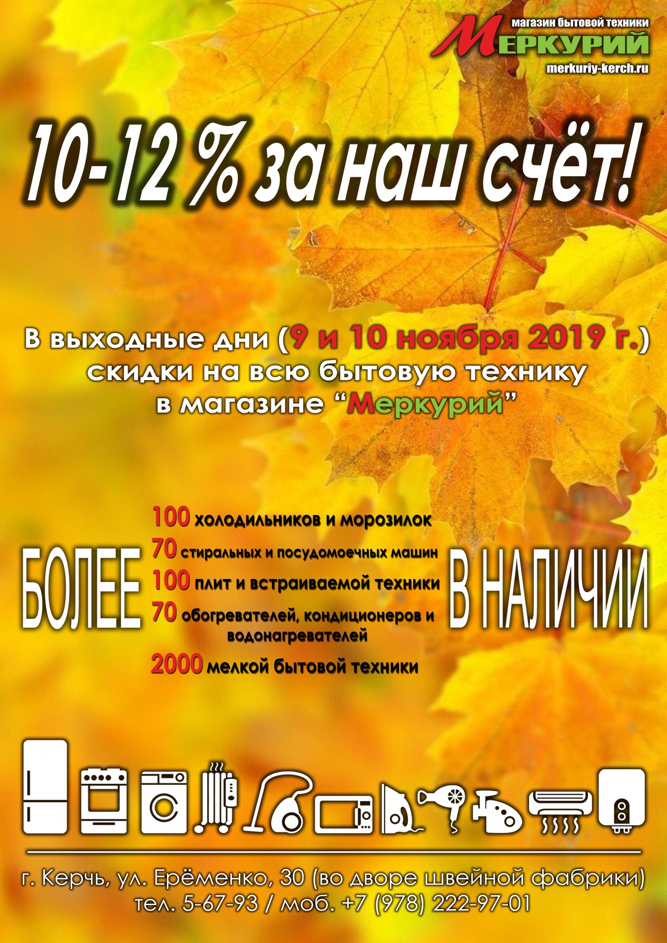 В выходные дни (9 и 10 ноября 2019 г.) скидки на всю бытовую технику в магазине «Меркурий».
