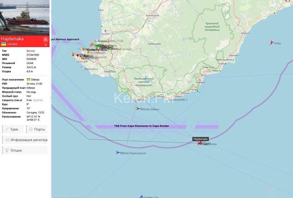 Украинские буксиры «Гайдамака», «Титан» и поисково-спасательный корабль «Сапфир» стоят примерно в 13 милях от берега в районе Алупки. Они ожидают задержанных в ноябре прошлого года кораблей ВМСУ, которые сегодня покинули Керчь. Об этом свидетельствуют данные системы AIS, - передает Керчь.ФМ