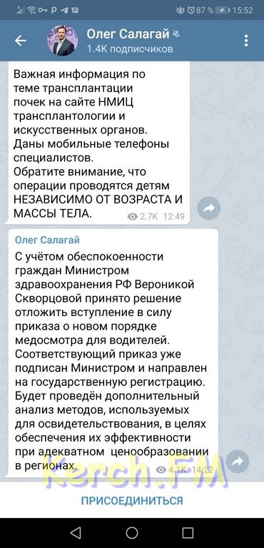 Подорожания медкомиссий для водителей в ближайшее время не предвидится - Министером здравоохранения РФ Вероникой Скворцовой принято решение отложить вступление в силу приказа о новом порядке медосмотра для водителей. Об этом на своей странице в Телеграмм канале сообщил замминистра здравоохранения РФ Олег Салагай, - предает Керчь.ФМ.