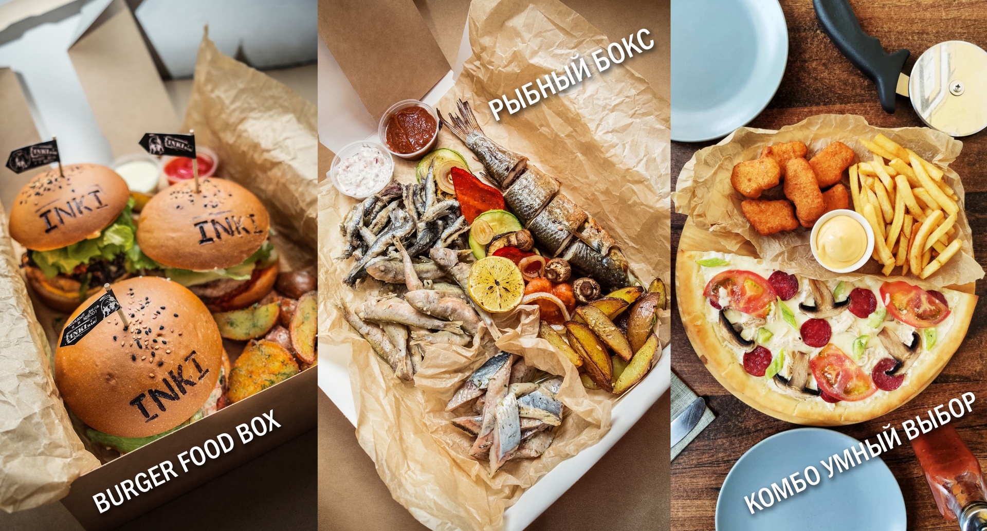 Рыбный бокс. Черноморская рыбешка: барабулька, кефаль, хрустящая хамса-фри и местная сельдь, с печеными овощами гриль и румяным картофелем с чесноком и разморином. Подается с пикантным томатным соусом и соусом Тар-тар.