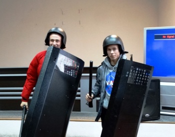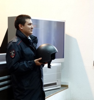 После просмотра видеофильма специалист по вооружению Алексей Убелис наглядно показал ребятам, какие средства защиты используют сотрудники полиции. Юные гости с удовольствием примерили бронежилет, каску и на несколько минут окунулись в полицейские будни, прочувствовав на себе, как не просто в таком снаряжение сотрудникам нести службу.