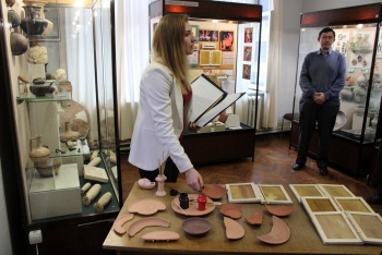В зале посетителей ожидал небольшой мастер-класс — на столе были разложены восковые таблички, фрагменты керамики, тушь и стили, для написания. Все желающие смогли почувствовать себя настоящим жителем Боспорского царства и понять как это — писать стилем на восковой табличке или тушью на керамике.