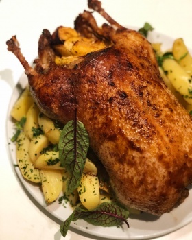• утка с яблоками (1750 г) 1950₽ / в подарок гарнир — картофель по-домашнему (450 г);