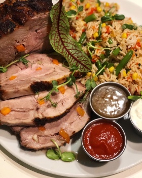 • буженина (1000 г) 1500₽ / в подарок 3 вида соуса (Ранч, горчично-медовый, чесночный) и гарнир — рис с овощами (600 г);