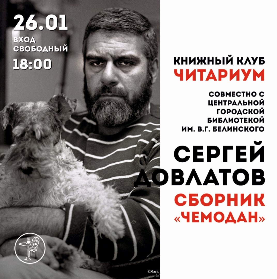 26.01: встреча книжного клуба «Читариум» - обсуждение творчества Сергея Довлатова и его сборника «Чемодан» (вход свободный, при поддержке Центральной городской библиотеки им В.Г. Белинского).