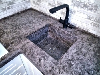 - Неприхотливость. В литом искусственном камне полностью отсутствуют даже незначительные микропоры. За счет этого он гигиеничный, не накапливает грязь, не способствует размножению бактерий и не вбирает запахи. В покрытие не въедается даже кофе или красное вино. Такую поверхность очень просто мыть и дезинфицировать. На ней не заводятся плесень и грибок.