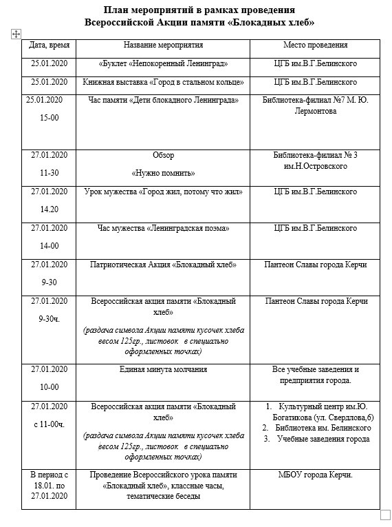 Также, Керчь присоединится ко Всероссийской акции «Блокадный хлеб». В Культурном центре им.Ю. Богатикова (ул. Свердлова, 6), Библиотеке им. Белинского, среднеспециальных учреждениях города и в университете будут организованы театрализованные точки с раздачей листовок и экспонированием образцов «Блокадного хлеба».