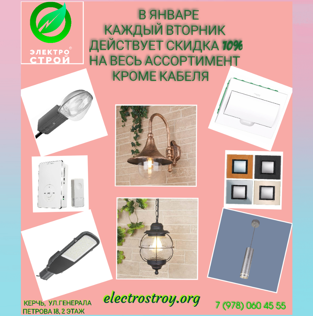 Магазин «Электрострой»: скидка каждый вторник 10% только в январе на весь ассортимент (вроме кабеля)! Автоматика, светодиодная продукция, розетки, выключатели, щитовое оборудование, прожектора и многое другое