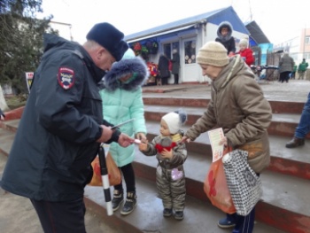 В качестве напоминания о Правилах дорожного движения стражи порядка вручают гражданам листовки, а самые маленькие участники дорожного движения получают брелки-светоотражатели.